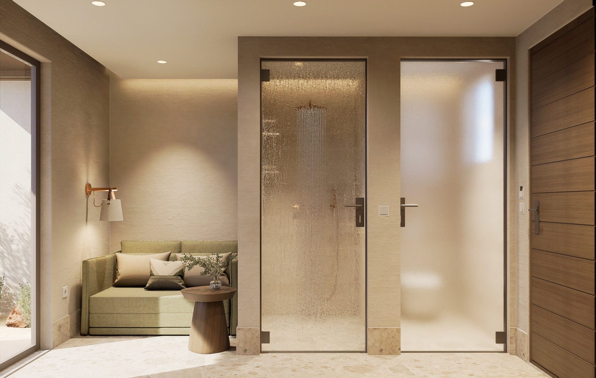 Modern walk-in shower bathrooms have been designed with daily relaxation rituals in mind. Fixed dispensers with elegant hair and body fragrances, spacious shelves for personal toiletries, and contemporary fittings create a comfortable and aesthetically refined space.