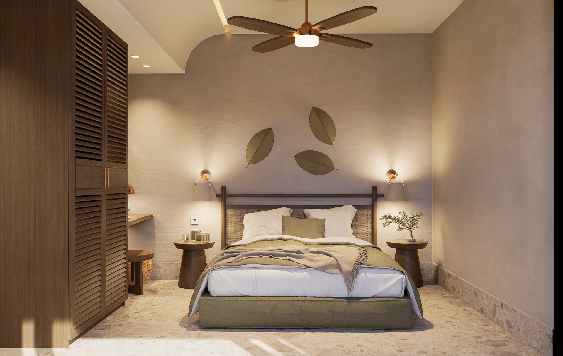 Individually controlled air conditioning, a ceiling fan, and blackout curtains provide full control over temperature and lighting — essential for guests who value peaceful relaxation.